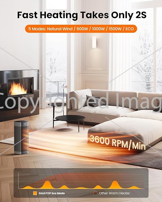 - Fast Heating Takes Only 2S - With the help of a powerful 3,600 rpm/min wind speed and 1500W PTC ceramic this space heater quickly sends out hot air, you can clearly feel the change from cold to warm in 2 seconds. With 5 modes, including natural wind, ECO, and 3 modes of hot air (600w/1000w/1500w), the heating temperature range is 41℉ to 95℉